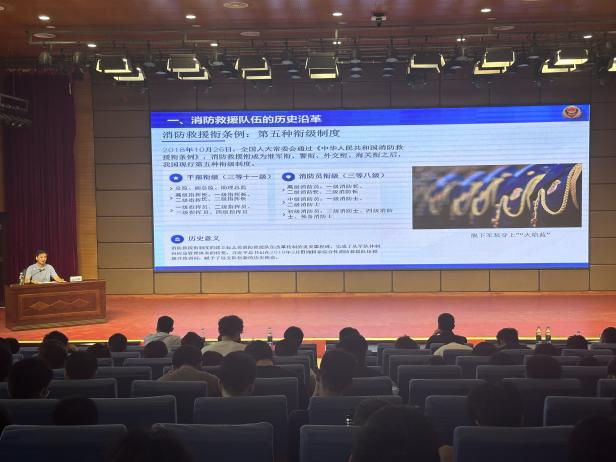 “百千万工程”讲座由王凯主持。高国顺以"培养专业人才,助力消防治理模式转型升级"为题,分享了行业前沿动态和典型案例,既有理论高度,又有现实价值,让同学们对消防救援工作有了更深入的了解,进一步激发了同学们的专业自信和学习热情。