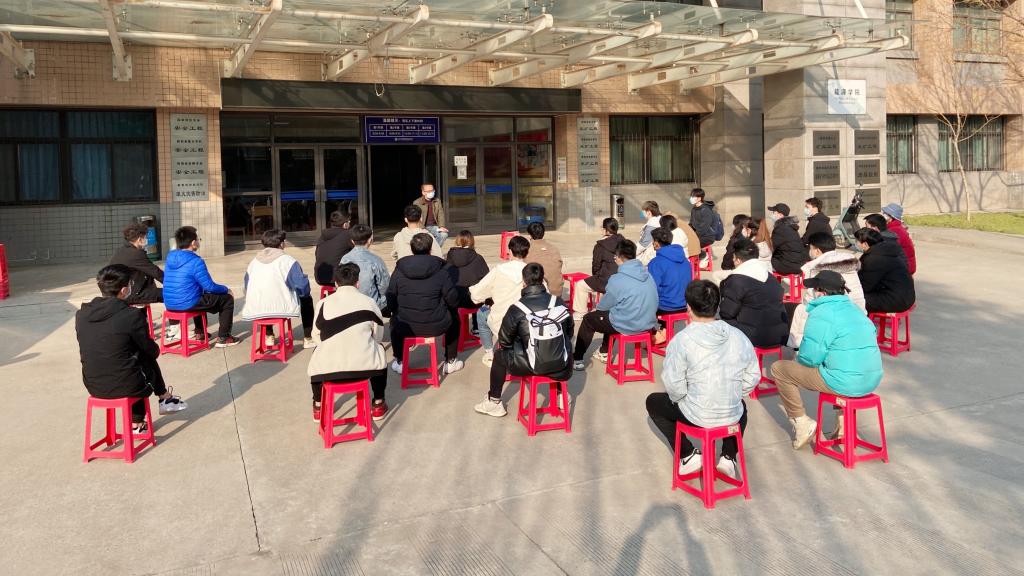 当日中午,学院党委书记杜勇、辅导员同超来到学生公寓,看望慰问落实居家隔离措施的学生宿舍,实地了解隔离学生思想动态和生活状况,亲自指导学生宿舍通风消毒。当日下午,学院在14号教学楼下户外广场召开学生干部恳谈会。学院党委书记杜勇、辅导员同超,全体本科学生干部代表、学生党员骨干参加会议。杜勇就近期学校疫情发展形势及防控政策进行了宣讲,并提出五点希望:一是要提高政治站位,把思想和行动统一到校党委的决策部署上来,正确认识并全力支持属地疾控部门及学校疫情防控相关安排;二是要充分发挥学生党员、学生骨干的先锋作用,各党团支部要结合“我为同学办实事”实践活动,凝聚人心;三是要充分备考,以实际行动开展诚信考试;四是要搞好宿舍卫生,落实通风消毒制度,切实改善自己的居住环境;五是要及时宣传奋战在疫情防控一线的先进典型和好人好事,营造不畏艰险、奋勇争先的深厚氛围,凝聚起众志成城、共克时艰的强大正能量。