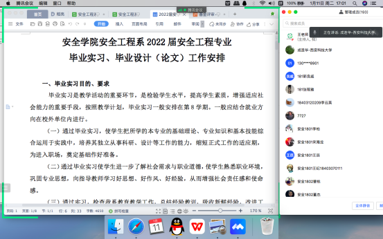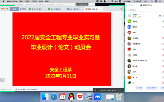 1月11日下午,安全工程系利用腾讯会议在线召开了2022届安全工程专业毕业实习暨毕业设计(论文)动员大会。副校长邓军、学院执行院长罗振敏、副院长成连华,全体带安全专业毕业设计的安全、消防、应急系指导教师以及2018级安全工程专业全体学生参加了大会。系主任王莉主持了会议。