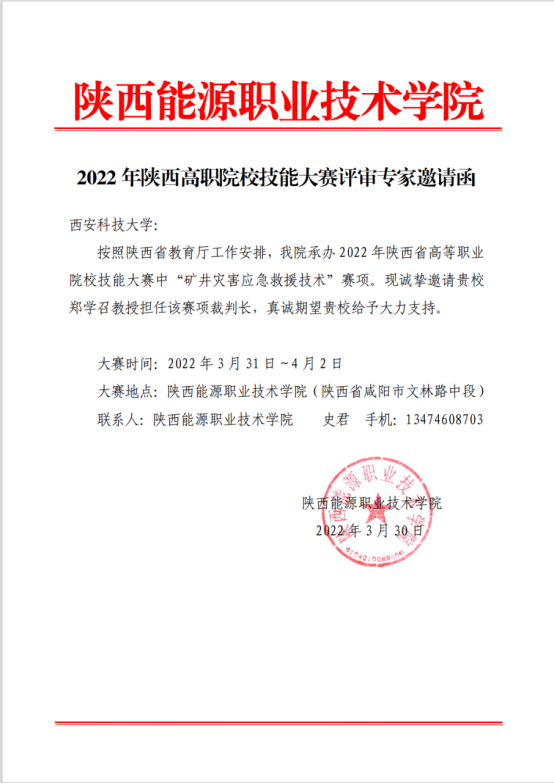 2022年4月1日,由陕西省教育厅主办、陕西能源职业技术学院承办的“2022年陕西省高等职业院校技能大赛”在咸阳举行。本次大赛共设置“矿井灾害应急救援技术”、“电子商务技能”、“光电技术”等126项赛项,是我省高等职业院校的重大比赛活动之一。