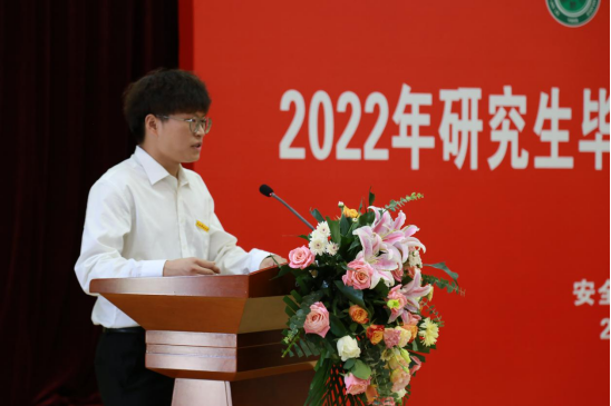 毕业典礼在庄严神圣的国歌声中拉开序幕,郭慧敏博士和周鹏辉同学分别代表毕业研究生和在校研究生发言。