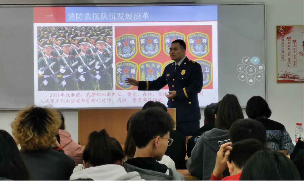 “消防月”系列讲座在临潼校区骊山校园3号教学楼404开讲。第一讲邀请中国消防救援学院训练部参谋贺松指挥员为消防救援系同学做题为“国家综合性消防救援队伍人才培养发展展望”的专业报告,报告会由消防救援系副主任赵婧昱主持。