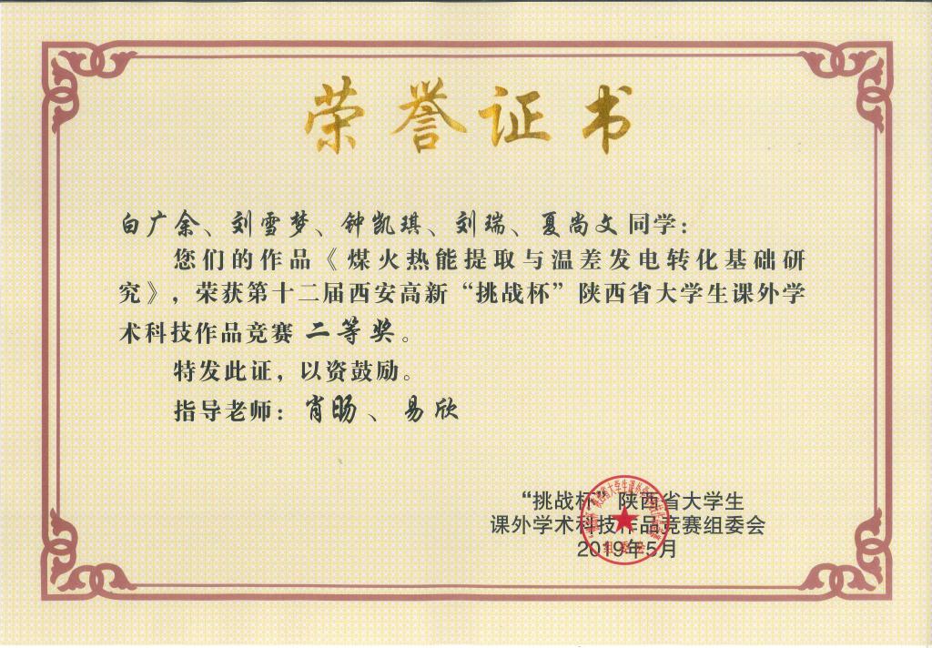 5月28日,由共青团陕西省委、中共陕西省委教育工委、陕西省科学技术协会、陕西省科技厅、陕西省社会科学院、陕西省学生联合会、西安高新区管委会共同主办,西北工业大学承办的第十二届西安高新“挑战杯”陕西省大学生课外学术科技作品竞赛终审决赛在西北工业大学长安校区落下帷幕。我院邓军、易欣老师指导,范星愿等7名同学完成的作品《煤矸石山自燃火灾热棒移热防灭火技术研究》荣获特等奖;肖旸、易欣老师指导,白广余等5名同学完成的作品《煤火热能提取与温差发电转化基础研究》荣获二等奖。