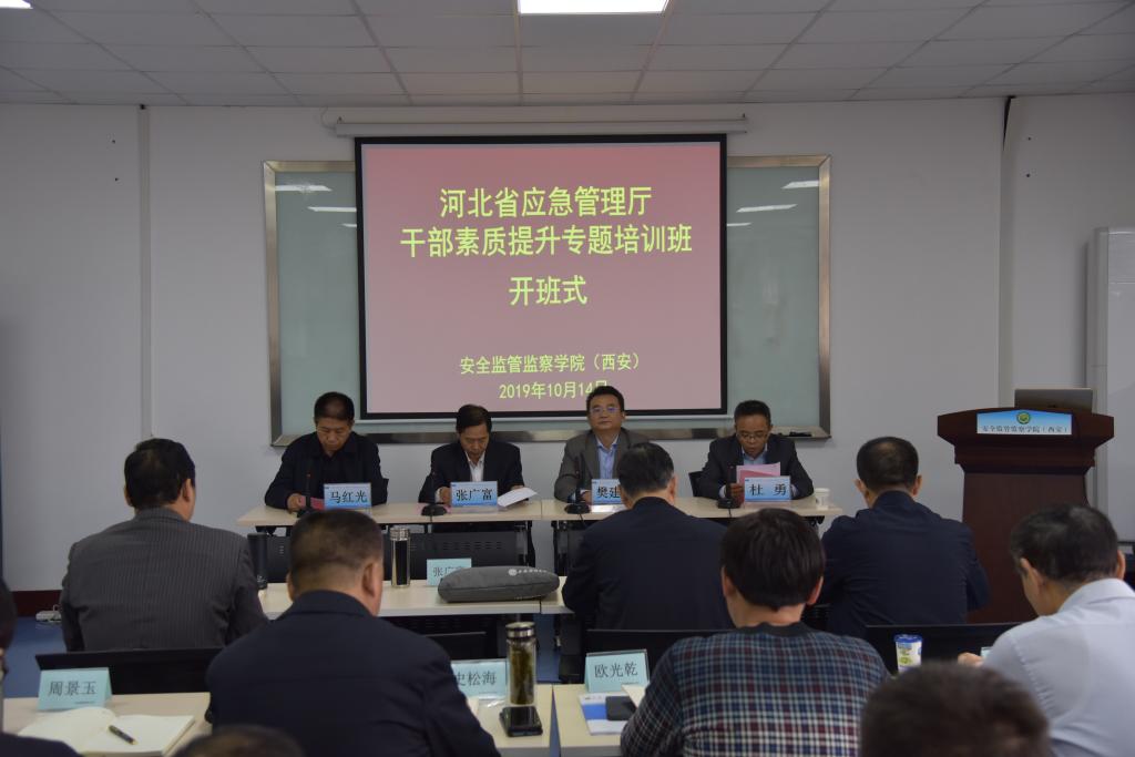 10月14日上午,河北省应急管理厅干部素质提升专题培训班在西安科技大学临潼校区骊山校园开班。河北省应急管理厅副厅长张广富,西安科技大学党委副书记樊建武,河北省应急管理厅人事培训处处长马红光,安全监管监察学院(西安)党委书记杜勇,以及来自河北省应急管理厅和雄安新区的48名学员参加了开班式,开班式由杜勇主持。