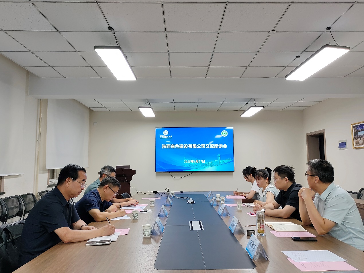 宣传片。王彩萍从师资队伍、学科方向、科研项目、社会服务等方面介绍了学院基本情况。孙旭军介绍了陕西有色建设有限公司概况及调研目的,仲辉、王毅等分别从市政建设项目施工安全和矿山建设项目施工安全介绍了基本情况及面临的问题。成连华介绍了课题组的研究方向及相关成果。