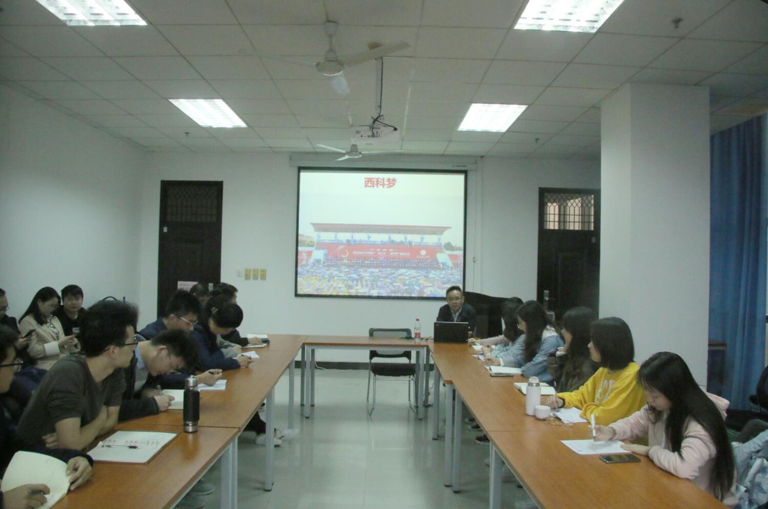 党委书记杜勇为在雁塔校区以“中国梦,西科梦,个人梦”为主题给2019级硕士研究生党支部讲授了一堂生动的党课。党课由研究生培养办公室主任刘黎主持。