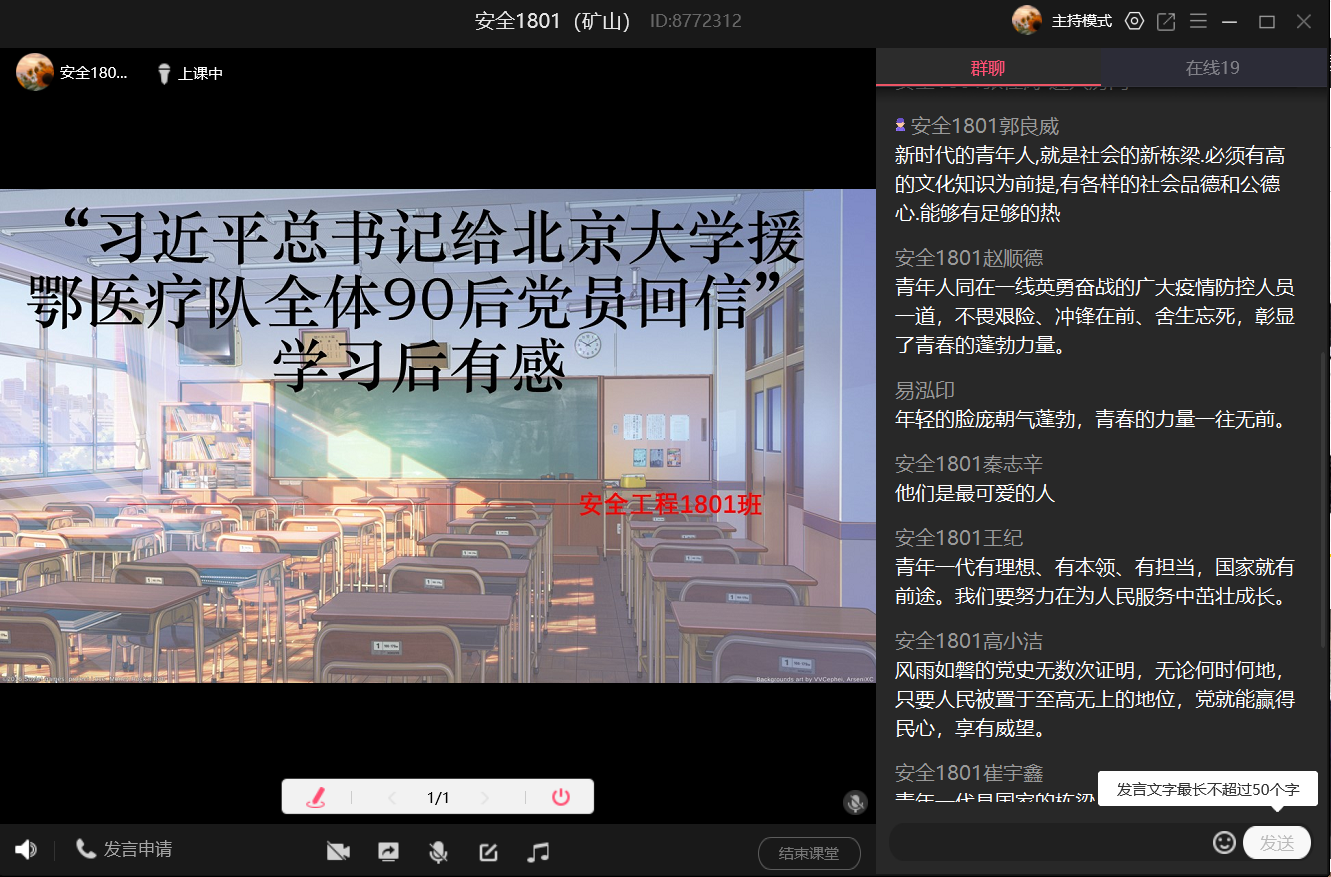 组织全体学工干部、全体学生开展“习近平总书记给北京大学援鄂医疗队全体90后党员回信”在线学习活动。师生们通过线下自学、线上集中学习,以线上主题团日活动、线上支部会、QQ群讨论、QQ群课堂主题班会导等形式完成学习,同学们结合自身实际谈了心得体会,一致认为习近平总书记的深情寄语和殷切嘱托,令人鼓舞,催人奋进,纷纷表示要为党和人民的事业作出新时代青年应有的贡献。