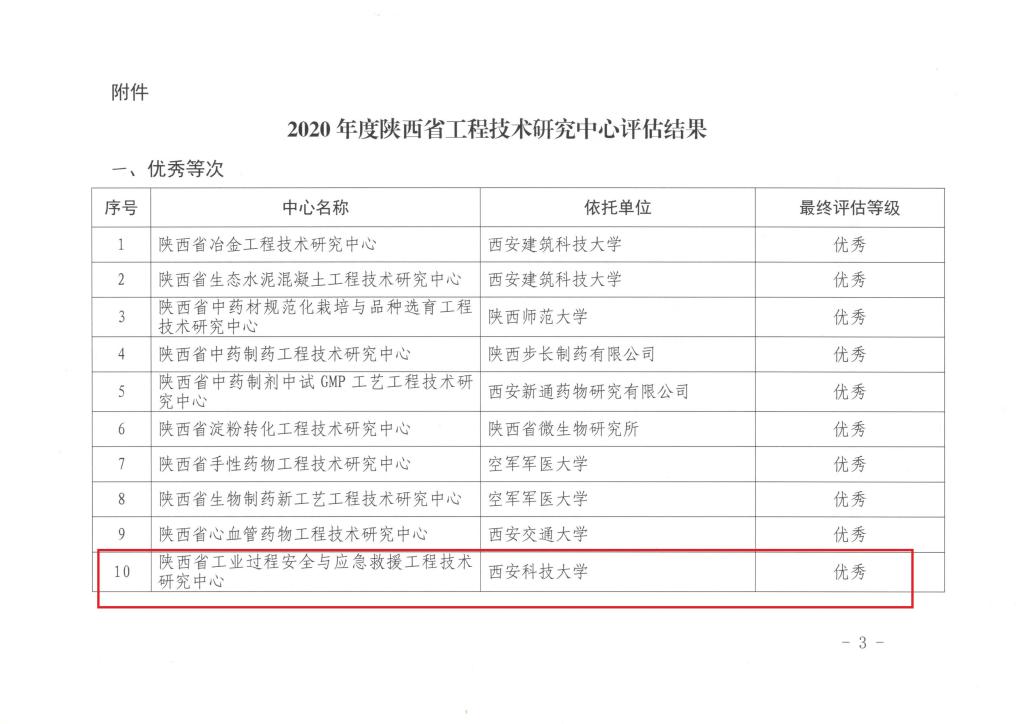 近日,陕西省科技厅发布了《关于2020年度陕西省工程技术研究中心评估结果的通报》,由我校邓军教授牵头、依托我校安全科学与工程学科建设的陕西省工业过程安全与应急救援工程技术研究中心评估优秀。本次全省有44家工程中心参加评估,其中获评优秀的仅为10个。