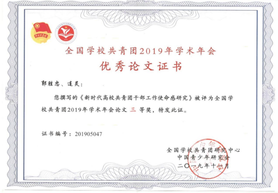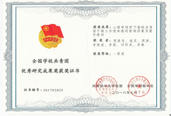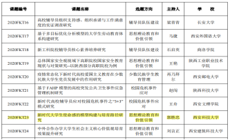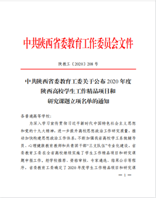 深入挖掘“精彩精神”的育人功能,寻找理论实践契合点,形成“精彩精神”融入大学生使命教育研究方向,发挥课题研究智库引擎作用。获批全国学校共青团研究重点课题、陕西高校学生工作研究课题、陕西省高等教育学会疫情防控专项研究课题、陕西省教育厅科研计划项目等省级以上课题4项,校级课题5项。研究成果获全国学校共青团优秀研究成果一等奖、全国学校共青团优秀论文三等奖1项,校级成果奖3项。