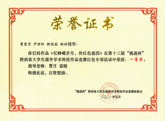 “青春使命·安全同行”实践团获批2019年全国百强实践团队,获2019、2021年陕西省优秀团队、2020年陕西省标兵团队;获陕西高校“万名学子扶千村”社会实践脱贫攻坚专项活动三等奖。志愿服务项目获陕西省青少年公益项目大赛三等奖;学生作品获“挑战杯”红色专项赛全国三等奖1项、省级一等奖、三等奖各1项;获陕西高校心理剧比赛一等奖、三等奖各1项。开展的相关活动被新华网、光明网、中国青年网、陕西省教育厅、云南电视台、陕西新闻网等媒体报道。