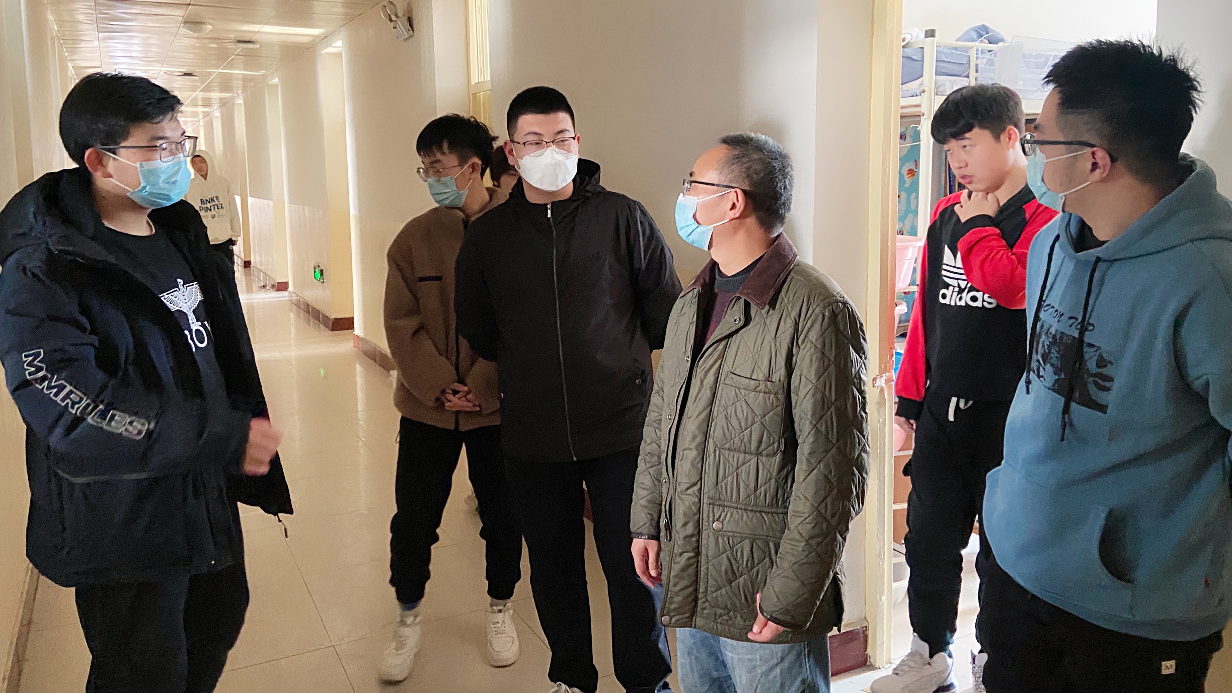 当日中午,学院党委书记杜勇、辅导员同超来到学生公寓,看望慰问落实居家隔离措施的学生宿舍,实地了解隔离学生思想动态和生活状况,亲自指导学生宿舍通风消毒。当日下午,学院在14号教学楼下户外广场召开学生干部恳谈会。学院党委书记杜勇、辅导员同超,全体本科学生干部代表、学生党员骨干参加会议。杜勇就近期学校疫情发展形势及防控政策进行了宣讲,并提出五点希望:一是要提高政治站位,把思想和行动统一到校党委的决策部署上来,正确认识并全力支持属地疾控部门及学校疫情防控相关安排;二是要充分发挥学生党员、学生骨干的先锋作用,各党团支部要结合“我为同学办实事”实践活动,凝聚人心;三是要充分备考,以实际行动开展诚信考试;四是要搞好宿舍卫生,落实通风消毒制度,切实改善自己的居住环境;五是要及时宣传奋战在疫情防控一线的先进典型和好人好事,营造不畏艰险、奋勇争先的深厚氛围,凝聚起众志成城、共克时艰的强大正能量。