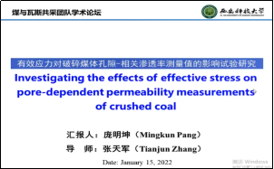 庞明坤、曹东强、李泽凡等31位博士生、硕士生分别就有效应力对孔隙依赖的影响规律以及破碎煤的渗透性测量、多主体参与下的建筑施工评价体系构建及应用、煤体对N2/CH4/CO2混合气体动态竞争吸附行为的实验研究等具体科研内容进行了详尽的中英文汇报,提问环节学术气氛活跃,同学们积极踊跃地与报告人员交流与论文主题相关的问题、思考与困惑。薛俊华教授、张天军教授等团队老师对报告环节逐一进行点评,为研究生们更好地完善科研和论文提出了非常有价值的意见和建议。