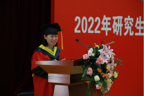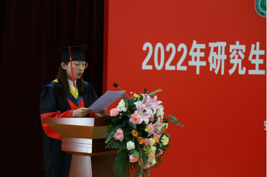 毕业典礼在庄严神圣的国歌声中拉开序幕,郭慧敏博士和周鹏辉同学分别代表毕业研究生和在校研究生发言。