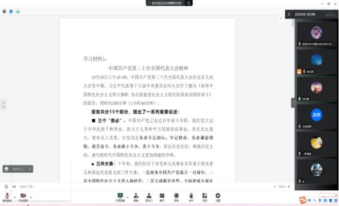 刘文刚在讲话中指出,党的二十大是在全党全国各族人民迈上全面建设社会主义现代化国家新征程、向第二个百年奋斗目标进军的关键时刻召开的一次十分重要的大会。党的二十大报告郑重宣示了我们党在新征程上举什么旗、走什么路、以什么样的精神状态、朝着什么样的目标继续前进,吹响了全面建成社会主义现代化强国、实现第二个百年奋斗目标的号角。科级干部是学院干事创业的中间力量,起着承上启下的重要作用,在具体工作中体现学院治学管理能力和水平,反映学院的工作状况与形象。他强调,我们要把学习宣传贯彻党的二十大精神是当前和今后一个时期的首要政治任务,自觉在学习贯彻党的二十大精神中铸牢忠诚品格、滋养初心使命、汲取奋进力量,为推动学院教育事业高质量发展贡献力量。一要重视理论学习,善于从烦琐的具体事务中摆脱出来,既要向书本学习,又要向实践学习,更要向身边的同志学习,通过学习增强政治能力、业务能力和执行能力,做学用结合的表率。二要强化责任意识,在责任面前、困难面前和矛盾面前敢于担当,及时发现解决师生急难愁盼问题,做担当作为的表率。三要坚持公开公正,把党的政治纪律和政治规矩挺在前,严格按党章办事、按政策办事、按原则办事,做秉公用权的表率。四要加强沟通交流,坚持大事讲原则、小事讲风格,工作讲配合、同志讲感情,平时多通气、遇事勤沟通,做团结奋进的表率。五要常怀敬畏之心,敬畏组织、敬畏权力、敬畏法纪,自觉将权利置于组织监督、舆论监督、社会监督、师生监督之下,做清正廉洁的表率。