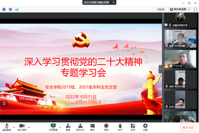 2019级、2021级本科生党支部通过腾讯会议线上召开党员大会,专题学习党的二十大精神会。会议由党支部书记袁刚主持。学院党委书记刘文刚应邀参加会议。支部成员学院团委书记周学刚、2021级学生辅导员段思颖和全体学生党员参加了会议。