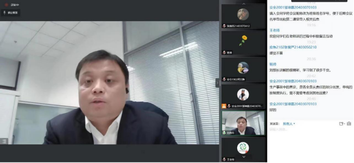 在互动问答环节,刘晓利结合自己多年的工作经验,就学生普遍关心的职业责任承担界定问题、如何处理事故善后问题、如何提升素质能力等问题,分享了个人的认识和观点,帮助同学们更加清楚地了解毕业后从事安全管理工作时解决问题的方法步骤,鼓舞同学们作为安全管理人员要坚持原则,树立安全责任感,锤炼底线思维和红线意识,不断提高防范化解重大安全风险的能力和水平。