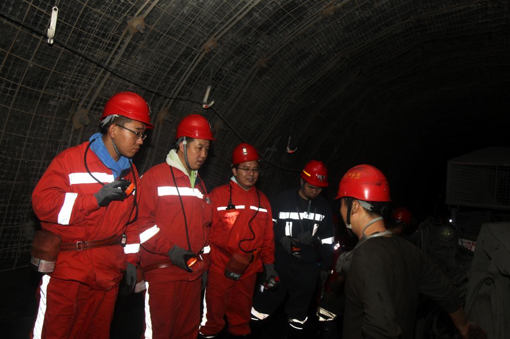 团队成员分成三组乘车进入塞上梅花第一井,随着车辆缓慢驶入井下,车里车外一片漆黑,大家的喧闹声逐渐变为沉默。有的同学因不适应黑暗的环境打开了矿灯,司机师傅立即制止:“在车里不能开灯,会影响司机的视线,如果矿灯照到工人眼睛,会造成安全隐患”。小小的“矿灯风波”,令实践队员们感受到了井下作业规程要求之高。