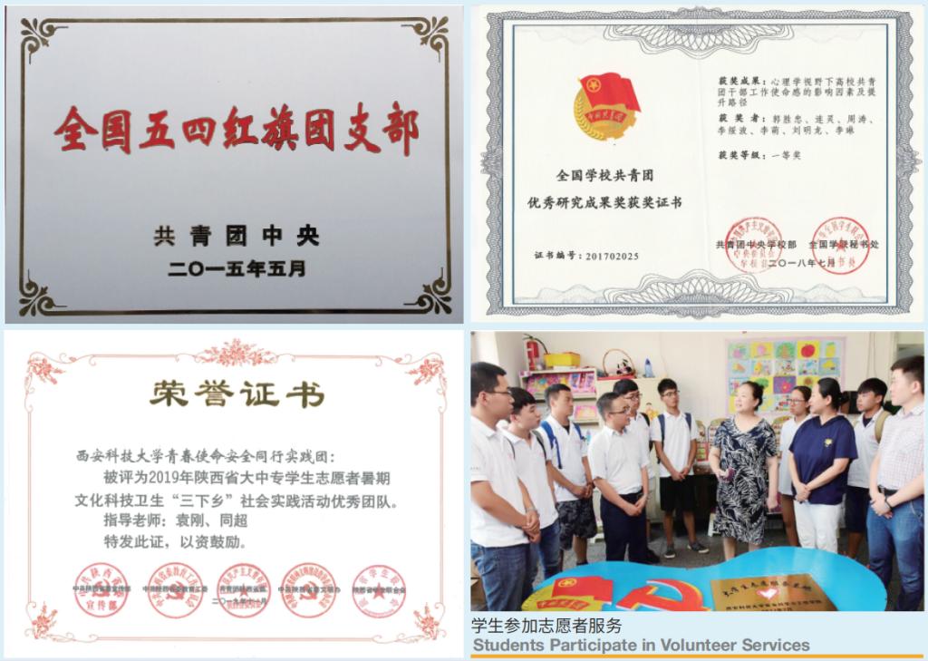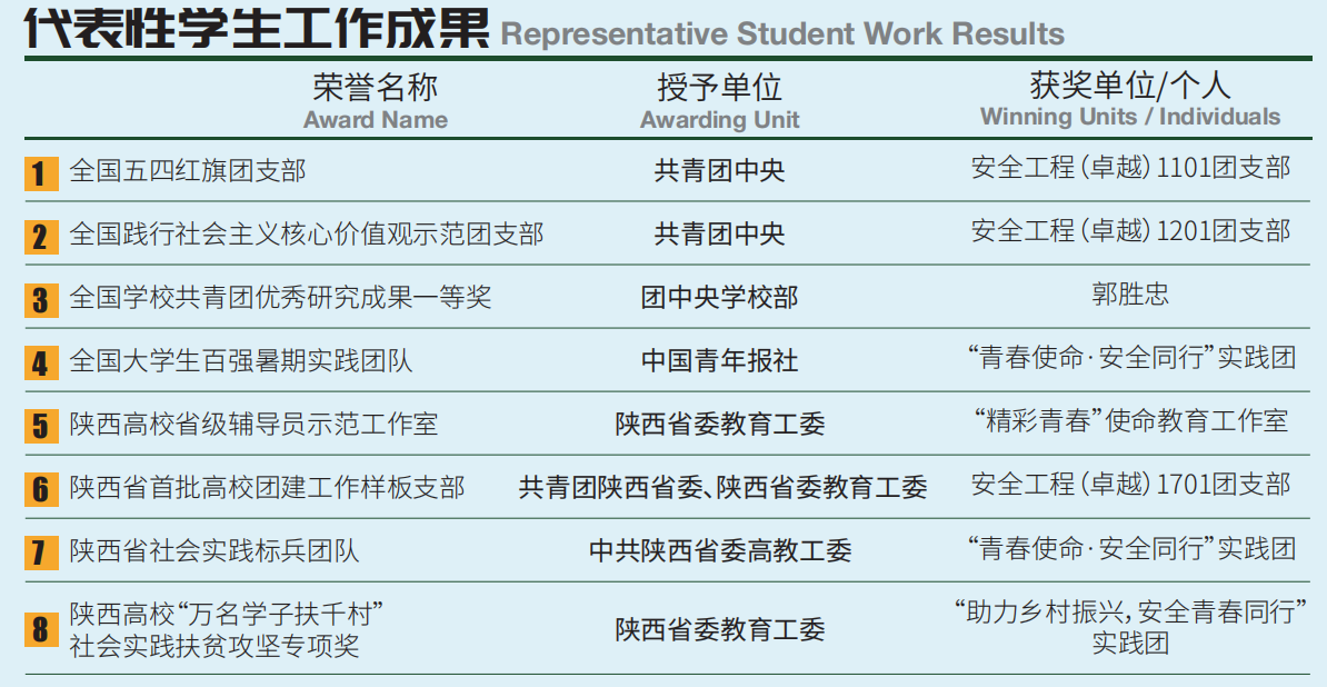 学生工作全面发展,构建了思想建设核心引领,科技创新、社会实践、心理健康、文化传承四引擎驱动工作格局。围绕“精彩精神”传承获批省级辅导员示范工作室,获批全国学校共青团研究重点课题等省部级课题 3项,获全国学校共青团优秀研究成果一等奖、优秀论文三等奖各1项。学生获得“全国五四红旗团支部”“全国践行社会主义核心价值观示范团支部”“陕西省团建样板支部”“全国煤炭行业优秀共青团员”表彰。科技创新活动获得“互联网 +”全国铜奖,“挑战杯”全国二等奖、累进创新奖、红色专项等奖励;获全国百强实践团队、省标兵团队、全国社会实践优秀个人等社会实践奖励;获省级公益项目大赛、省级心理剧比赛、心理知识竞赛优秀奖。